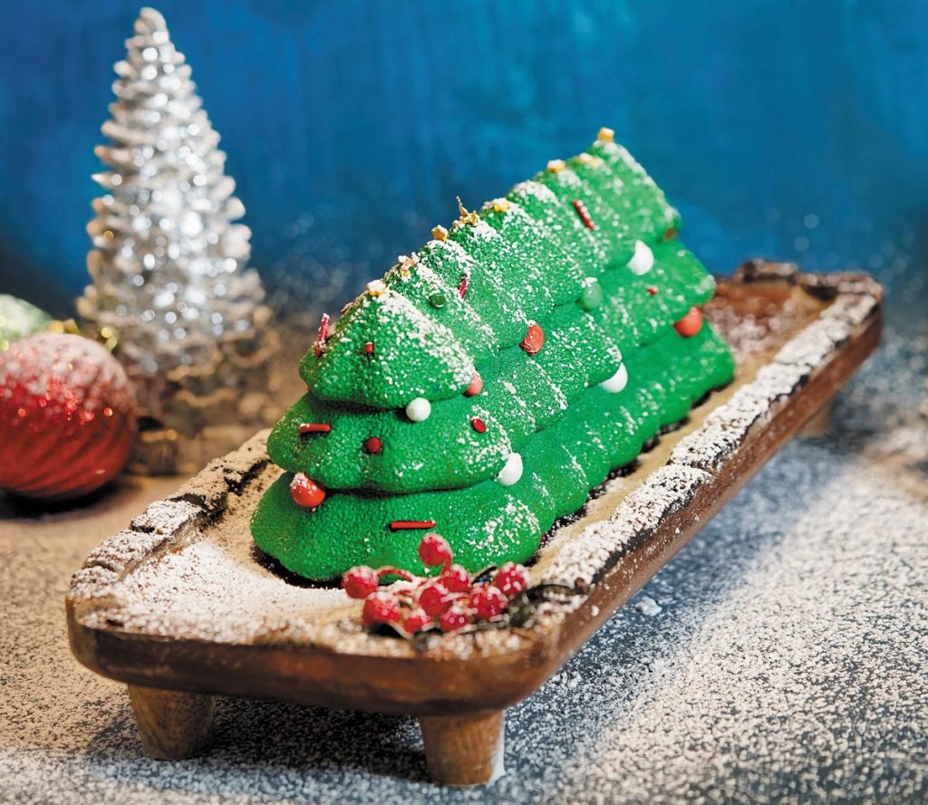 “I love the idea of having dessert as the main attraction and centerpiece for a Christmas family dinner,” says Woo. “I did a modern take on a Yule log and chose to represent it in its pure form, as a Yule tree.”