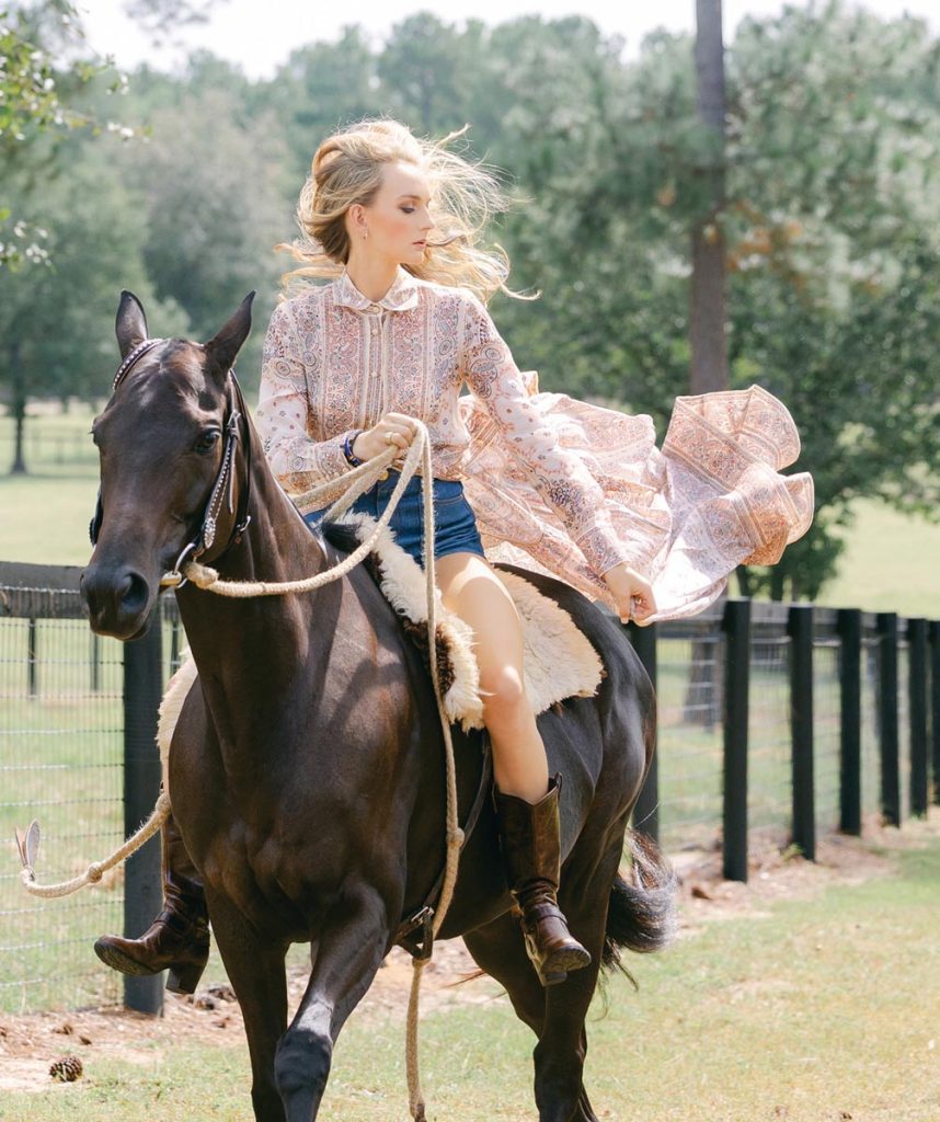 In her room, two walk-in closets overflow with clothes and shoes. “I love fashion,” she says, her eyes twinkling as she surveys the Zimmermann collection clothing brought in for a photo shoot. She describes her style as “boho” and favors flowy dresses and feminine details like lace and fringe, often paired with boots. Her sense of style and striking features have earned her a global brand ambassadorship for U.S. Polo Assn., and so far she’s enjoyed her brush with modeling. It’s a different side of Hope that is hard to reconcile with the powerhouse on the polo field, but it’s also part of the dichotomy that often defines female polo players.