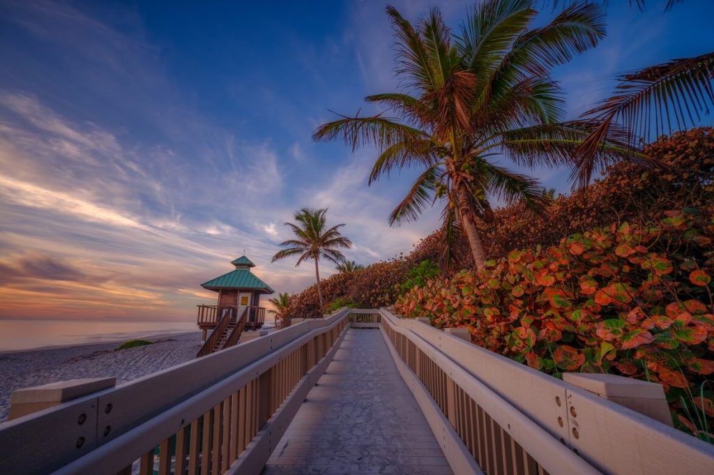 The two-mile-long stretch of Delray Beach sits comfortably between Boca Raton and West Palm Beach. It offers easy accessibility and a tranquil experience, thanks to the beach’s calm waves and warm waters. Its boundaries are marked by sand dunes, which act as natural barriers. After your beach trip, explore one of the many Atlantic Avenue restaurants just a short walk from the sand.