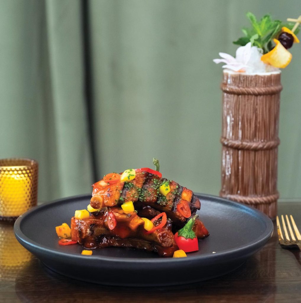 Behind the Pairing: “The idea is sweet heat and cool finish. Our grill provides natural smokiness, giving the ribs a rich and robust roundness, balanced with our spicy peach glaze. The cocktail [by mixologist Maggie Prillaman] is prepared with a brown sugar– and toasted peach–infused Rumhaven Coconut Rum, [which serves] as the base of our signature mai tai with a house-made orgeat.”
